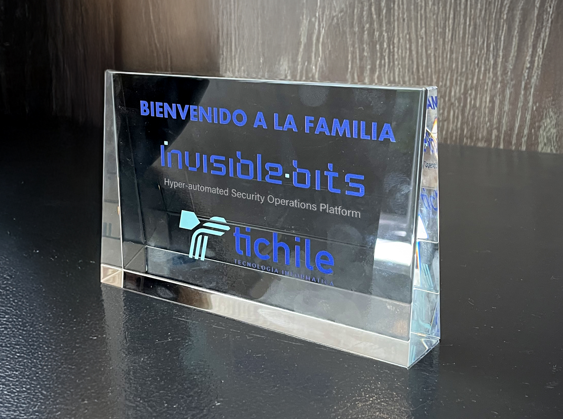 El galvano de metacrilato entregado simboliza más que un objeto: es un sello visible de unión entre los tres actores. El texto “Bienvenido a la familia Invisible Bits Hyper-automated Security Operations Platforms” expresa la integración de tichile al ecosistema tecnológico de Invisible Bits y, a su vez, muestra la capacidad conjunta para desplegar plataformas de seguridad automatizadas (“hyper-automated”) adaptadas a los desafíos de hoy y mañana. La presencia del logo de tichile refuerza que esta alianza tiene una dimensión local, concreta y operativa en Chile.